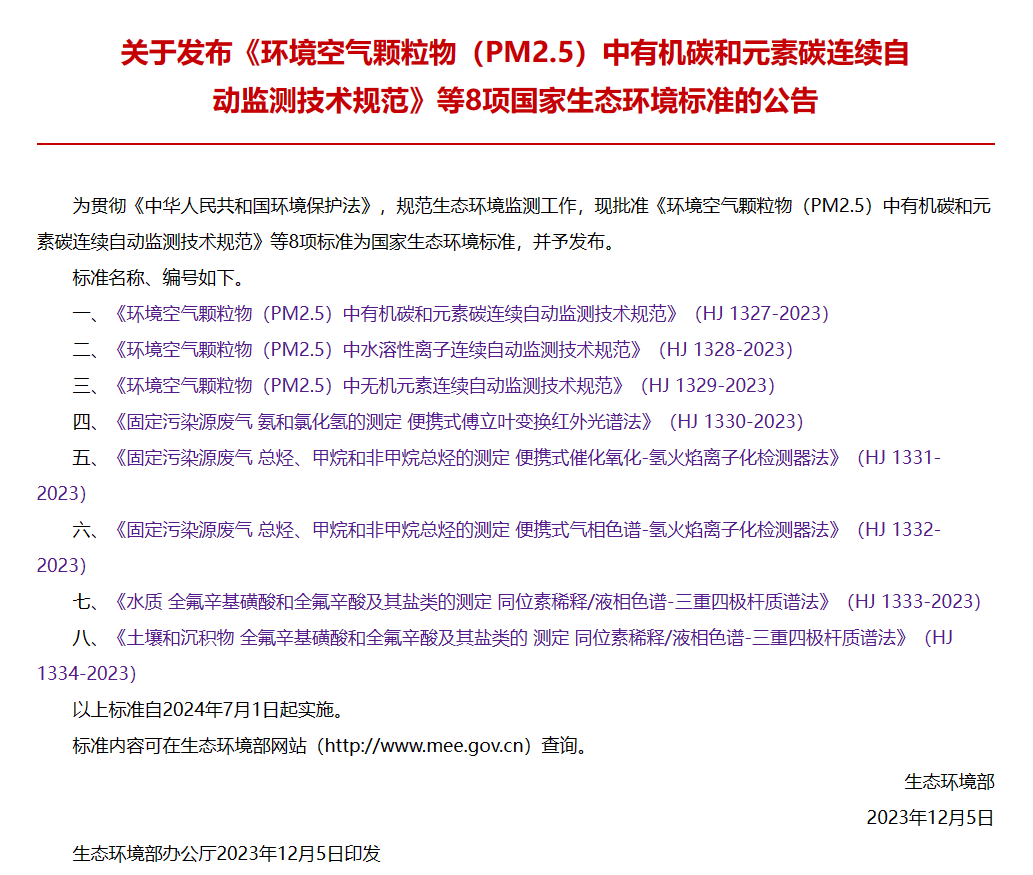 全氟化合物作為一種表面活性劑和保護劑,自20世紀50年代開始生產(chǎn)以來被廣泛應(yīng)用于工業(yè)生產(chǎn)和日常用品中,如地毯、皮革、地板蠟等。全氟化合物具有高毒性、持久性、生物累積性和遠距離遷移性等持久性有機污染物的特點。2023年3月1日,《重點管控新污染物清單(2023年版)》正式生效,清單包含了全氟辛基磺酸及其鹽類、全氟辛酸及其鹽類等14種類重點管控新污染物。2023年12月5日,生態(tài)環(huán)境部首次發(fā)布HJ 1333-2023《水質(zhì) 全氟辛基磺酸和全氟辛酸及其鹽類測定 同位素稀釋/液相色譜-三重四極桿質(zhì)譜法》和HJ 1334-2023《土壤和沉積物 全氟辛基磺酸和全氟辛酸及其鹽類的測定 同位素稀釋/液相色譜-三重四極桿質(zhì)譜法》2項標(biāo)準,為新污染物治理提供支撐。