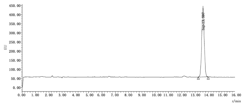 3檢測條件 3.1液相條件 色譜柱 Agilent eclipse XDB-C18 (4.6×250 mm,5.0 um) 柱溫 35 °C 流速 1.0 mL/min 進樣量 20 μL 流動相 乙腈+水=88+12 熒光檢測器 激發波長384nm,發射波長406nm 3.2色譜圖 圖3.苯并(a)芘液相色譜圖(1.0 ng/mL)