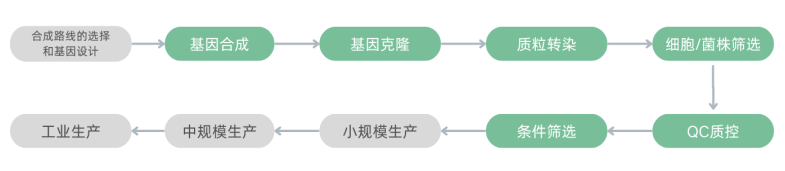 合成生物學(xué)的全流程通常包括前期的基因設(shè)計(jì)與合成,表達(dá)載體的克隆,表達(dá)菌株或細(xì)胞的篩選,表達(dá)產(chǎn)物的鑒定,表達(dá)條件的篩選,以及后續(xù)為大規(guī)模生產(chǎn)所進(jìn)行的逐級(jí)測(cè)試過程。