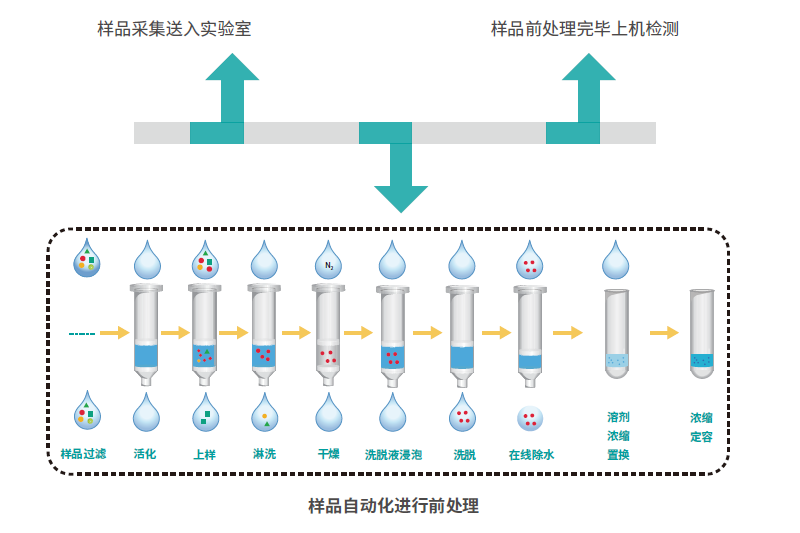 該產品可自動化完成大體積水樣前處理過程中的過濾、活化、上樣、淋洗、干燥、洗脫、濃縮轉溶、定容等操作,應用于各種水質檢測實驗室的前處理凈化富集過程,完全自動化無需實驗員的長時間值守,避免實驗員與有毒試劑接觸,輕松打造智能安全的水質前處理實驗室。