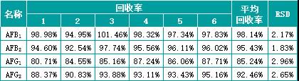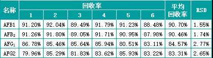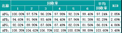 玉米中添加水平為2ug/kg的黃曲霉毒素G2、B2、G1和B1的回收率結果: