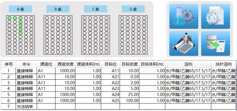 使用睿科Auto Prep 200全自動液體樣品處理工作站可實現標準品的全自動化配置,可將購買的混合標液(1000ug/L)通過工作站的直接稀釋模式,配置成濃度為10ug/L的工作中間液,緊接著可通過程序設置,吸取該工作液,配置一條濃度分別為0.5ug/L,2.0ug/L,5.0ug/L,25ug/L和100ug/L的標準工作曲線。