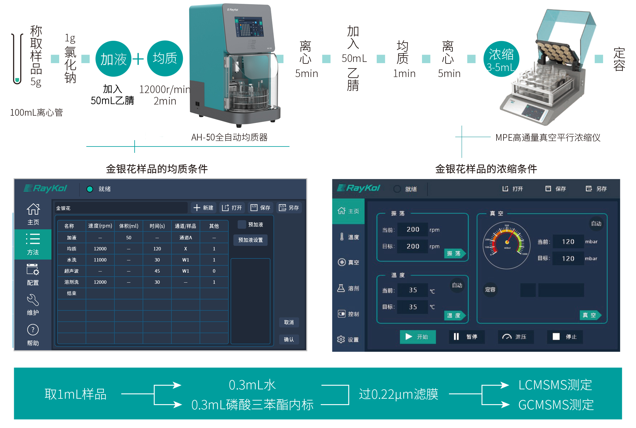 本方法采用睿科AH-50全自動均質器進行批量提取,提取液經MPE高通量真空平行濃縮儀進行濃縮,然后用Fotector Plus高通量全自動固相萃取儀對提取液進行凈化,最后再用MPE高通量真空平行濃縮儀對洗脫液進行濃縮,實現了金銀花制備過程全流程自動化。在40μg/kg的加標水平下GC-MS/MS法中33種化合物的回收率在71.5-118.8%之間,RSD值小于10%;在20μg/kg的加標水平下LC-MS/MS法中30種化合物的回收率在72.1-120.5%之間,RSD值小于10%,滿足實驗要求。