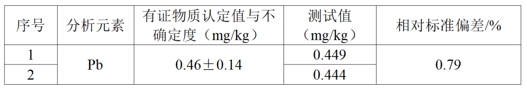 為了驗(yàn)證該方法的準(zhǔn)確度和精密度,使用ICP-MS上機(jī)測(cè)定。測(cè)試結(jié)果如下表所示,測(cè)試兩個(gè)質(zhì)控樣均在認(rèn)定值內(nèi)且相對(duì)標(biāo)準(zhǔn)偏差滿足要求。